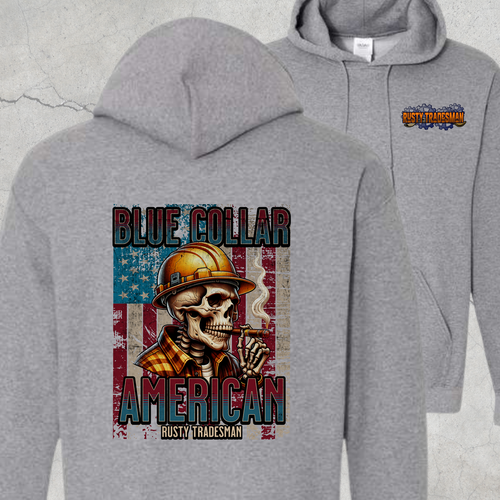 Show your pride in hard work, grit, and the American spirit with our “Blue Collar American” tee. This premium, jet‑black or graphite heather shirt puts the spotlight on a rugged skeleton tradesman—complete with yellow hard hat and flannel shirt—leaning into a smoldering cigar, all set against a distressed U.S. flag backdrop. Bold, vintage‑style lettering proclaims “BLUE COLLAR” across the top and “AMERICAN” at the bottom.