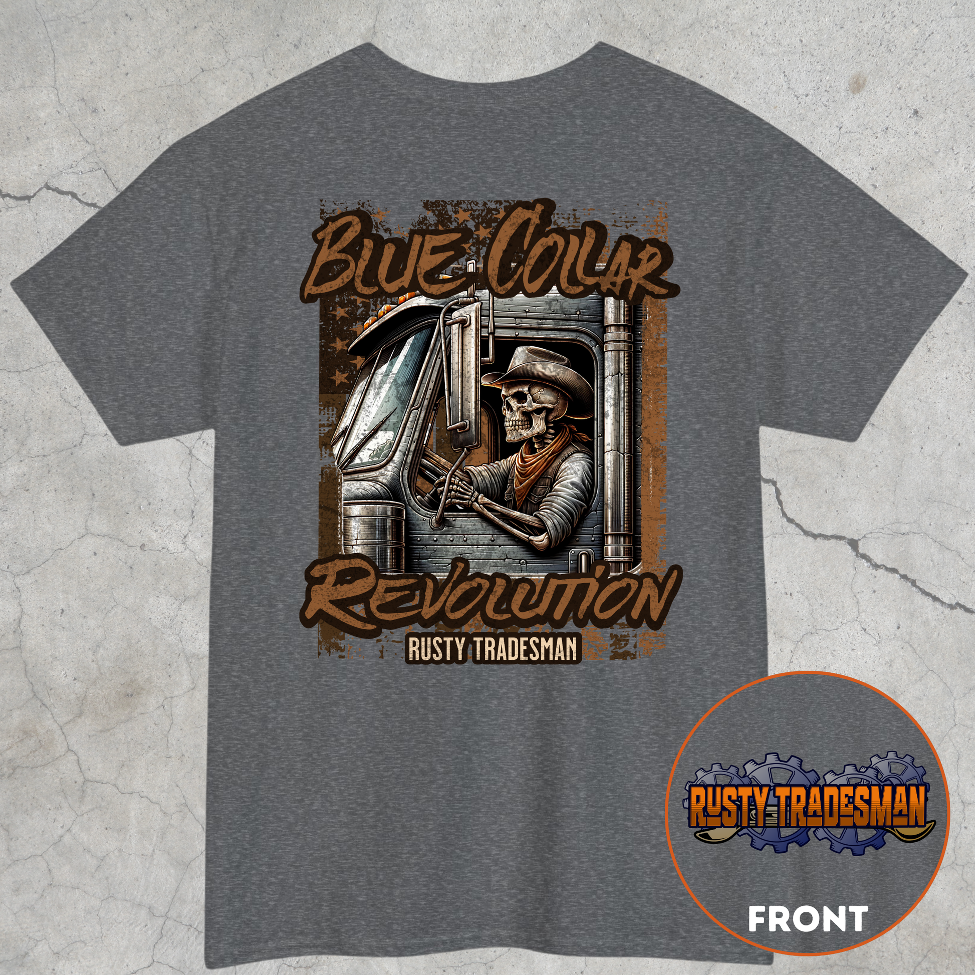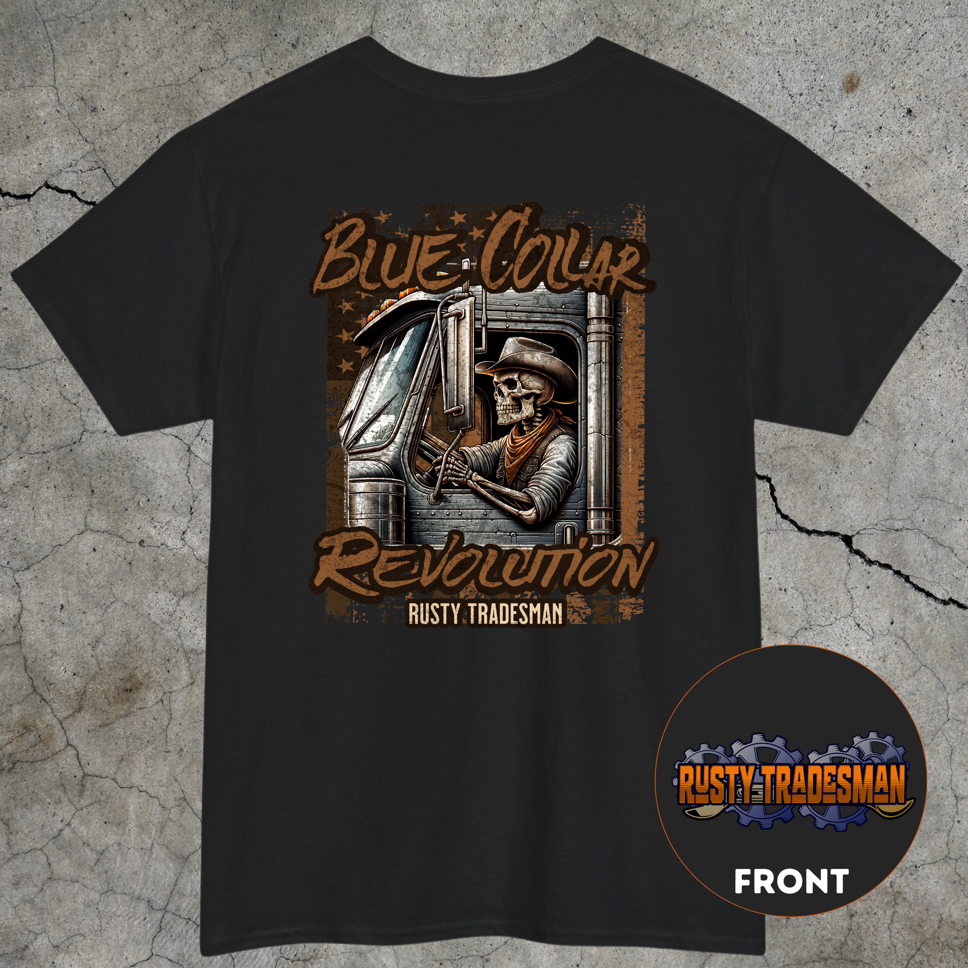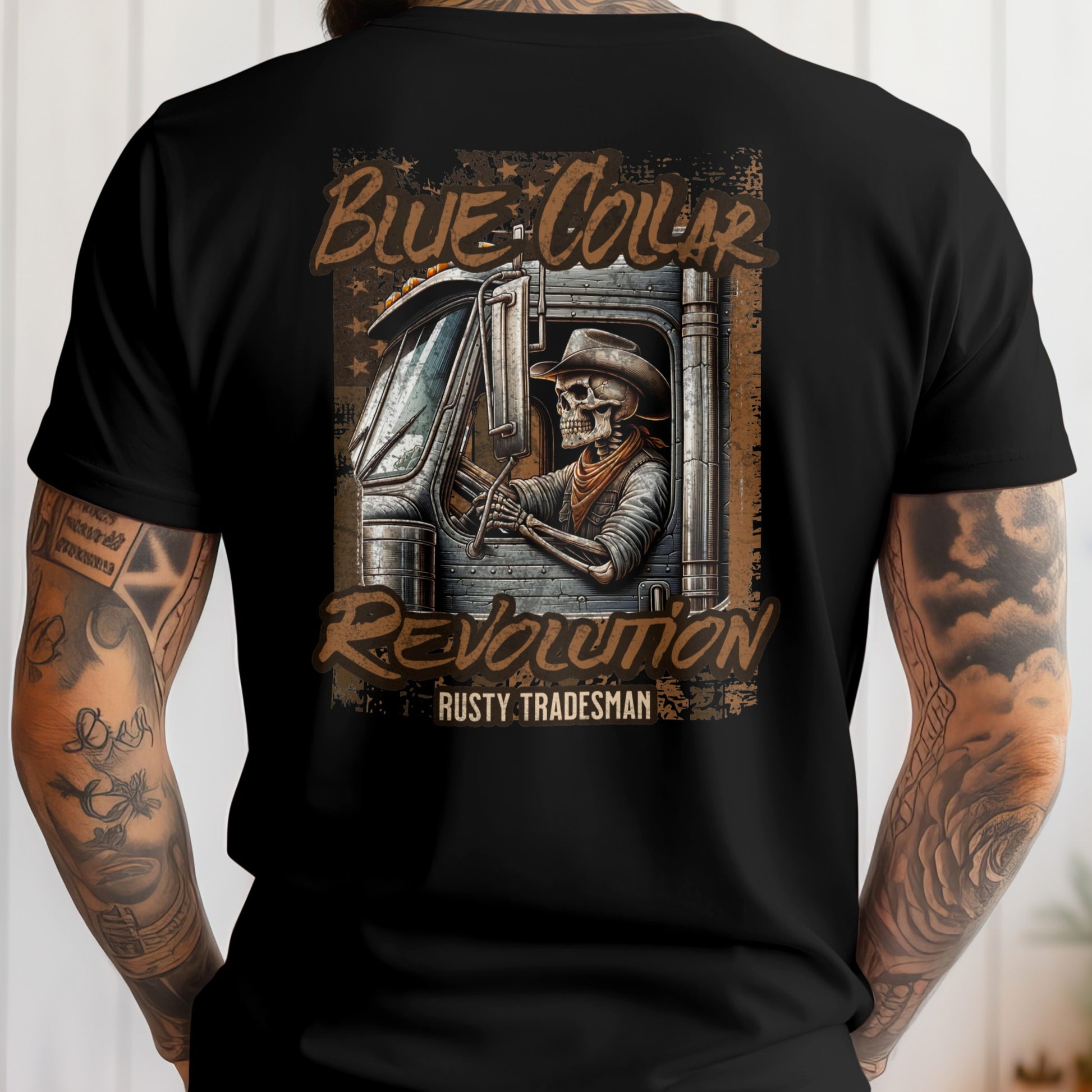 Join the movement. “Blue Collar Revolution” isn’t just a graphic—it’s a declaration. Featuring Rusty, the legendary skeletal cowboy, gripping the wheel of a big rig, this design honors the heart and horsepower behind America’s working class. Every mile, every load, every long-haul night—this shirt pays tribute to the blue-collar warriors who keep the country running.