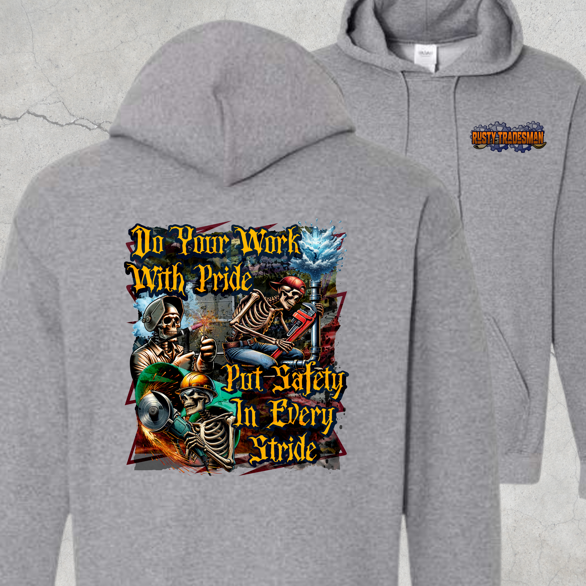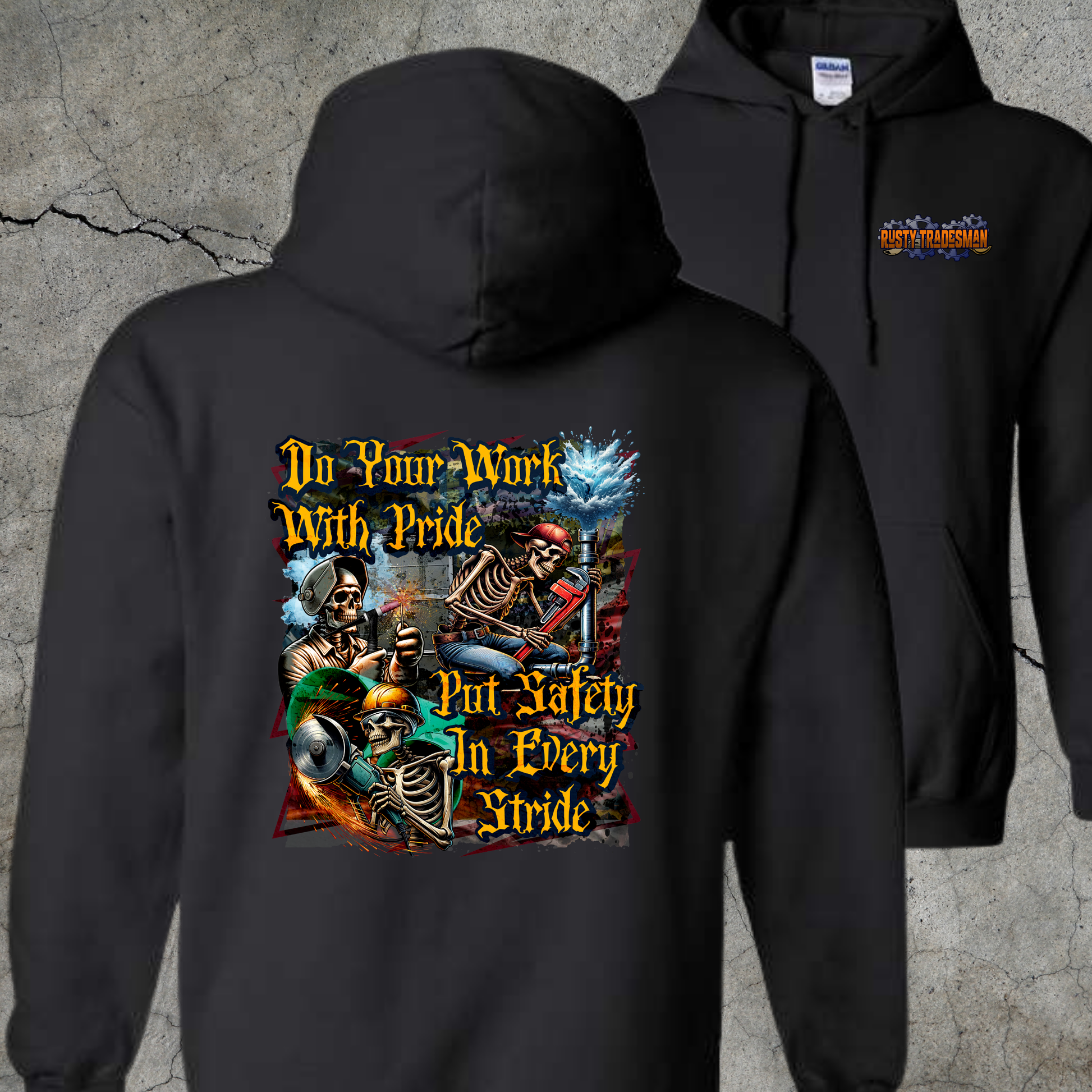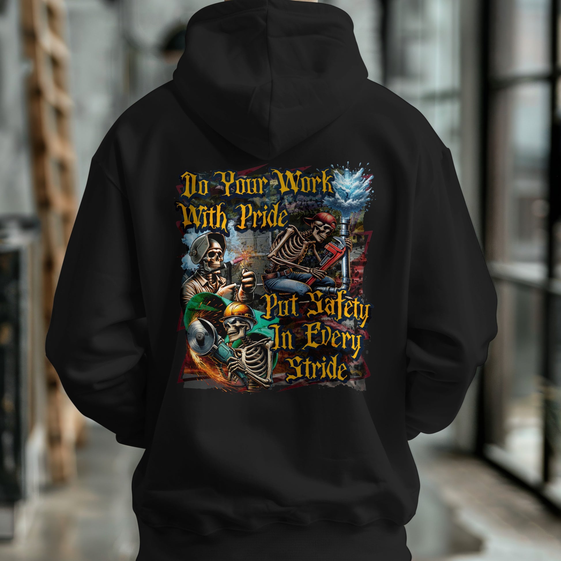 Step onto the job site with bold grit and a no-nonsense attitude in our “Do Your Work With Pride / Put Safety in Every Stride” design. This piece features a crew of skeleton tradesmen—welding, HVAC, pipefitter, and plumbing—all captured mid-action in an explosive, high-detail style that honors the working class. Perfect for welders, pipefitters, grinders, and blue-collar warriors who know that pride and safety go hand-in-hand. Whether you're clocking in or out, this shirt keeps the message clear: real work deserves respect.