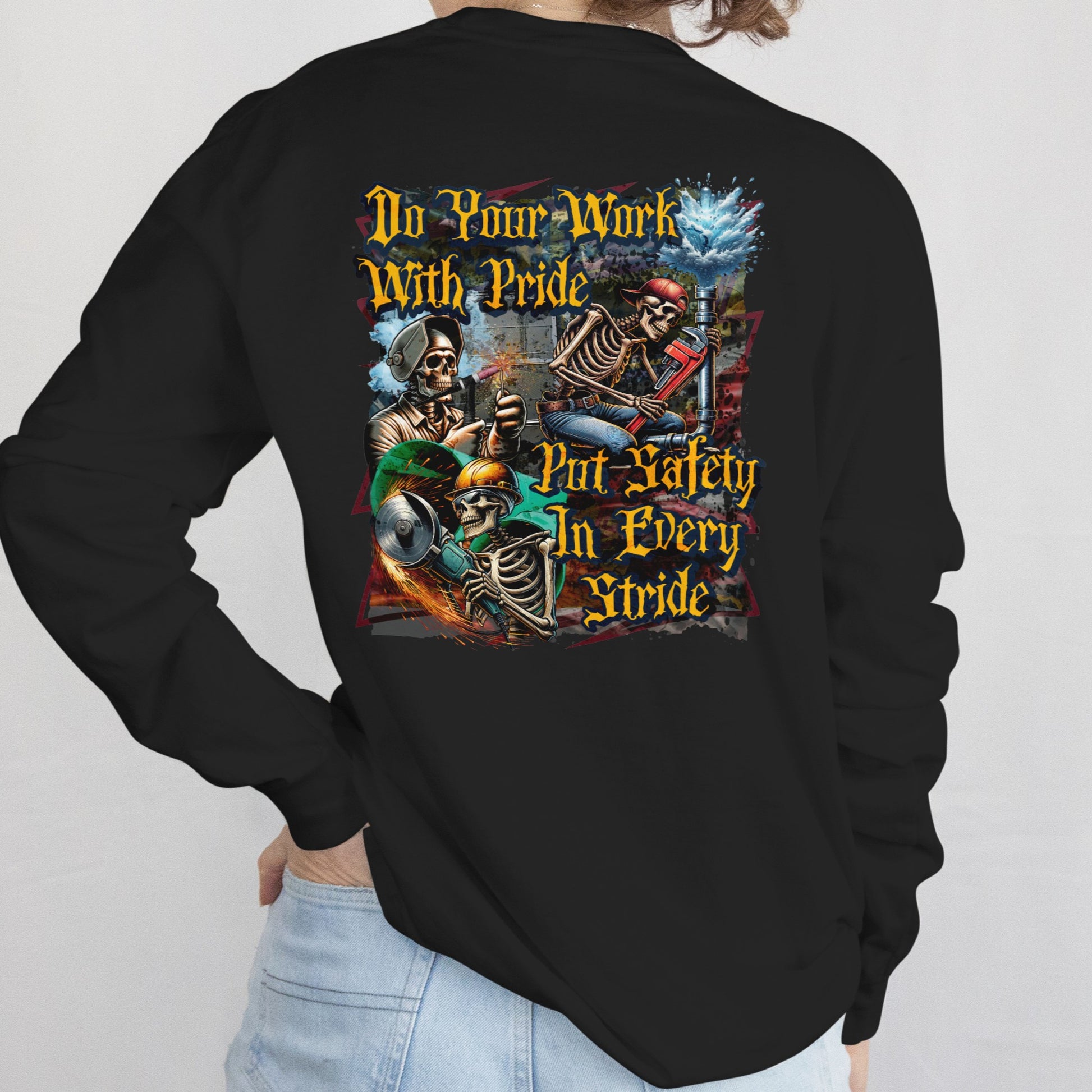 Step onto the job site with bold grit and a no-nonsense attitude in our “Do Your Work With Pride / Put Safety in Every Stride” design. This piece features a crew of skeleton tradesmen—welding, HVAC, pipefitter, and plumbing—all captured mid-action in an explosive, high-detail style that honors the working class. Perfect for welders, pipefitters, grinders, and blue-collar warriors who know that pride and safety go hand-in-hand. Whether you're clocking in or out, this shirt keeps the message clear: real work deserves respect.