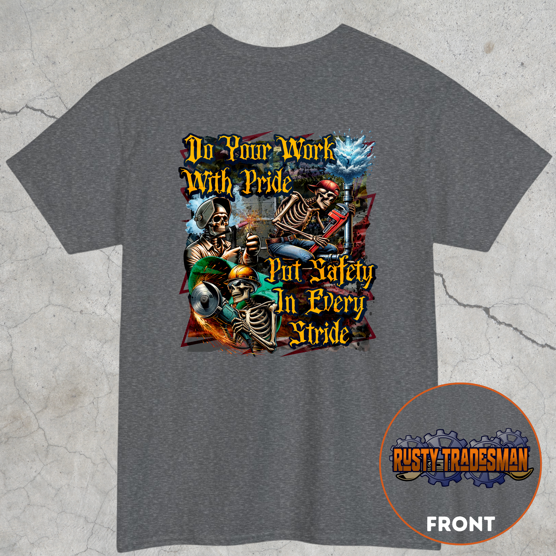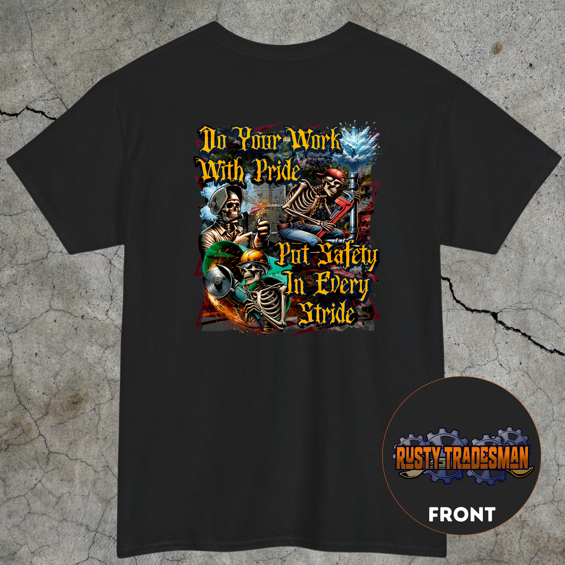 Step onto the job site with bold grit and a no-nonsense attitude in our “Do Your Work With Pride / Put Safety in Every Stride” design. This piece features a crew of skeleton tradesmen—welding, HVAC, pipefitter, and plumbing—all captured mid-action in an explosive, high-detail style that honors the working class. Perfect for welders, pipefitters, grinders, and blue-collar warriors who know that pride and safety go hand-in-hand. Whether you're clocking in or out, this shirt keeps the message clear: real work deserves respect.