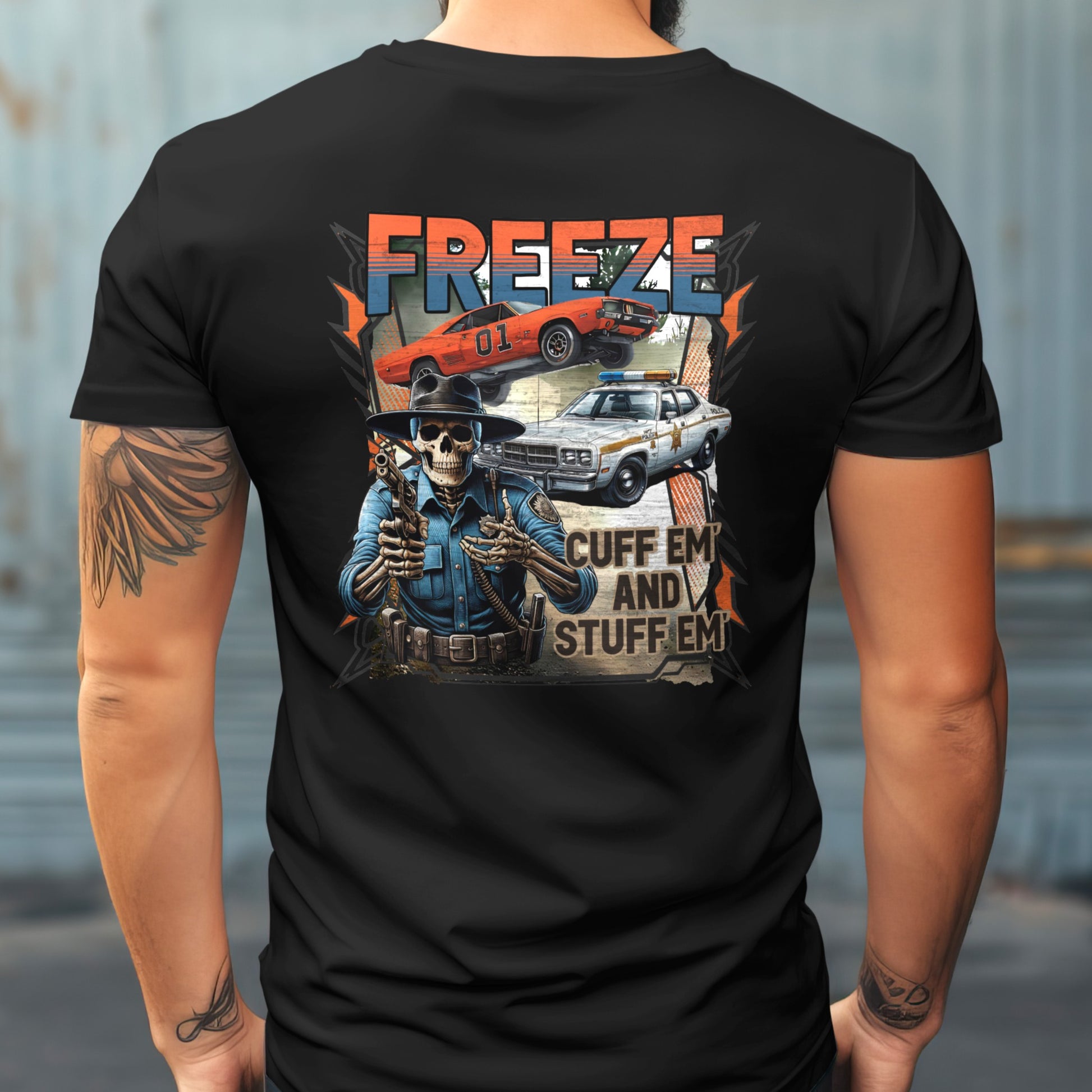 Featuring Rusty decked out as a hardline sheriff, gun drawn and finger pointing, with vintage muscle cars tearing up the scene behind him—this one's a throwback to the wildest car chases and no-nonsense lawmen of the South. With the bold command “FREEZE” and the punchline “Cuff ’Em and Stuff ’Em,” it’s a tribute to classic cop shows, old-school police work, and raw American grit.