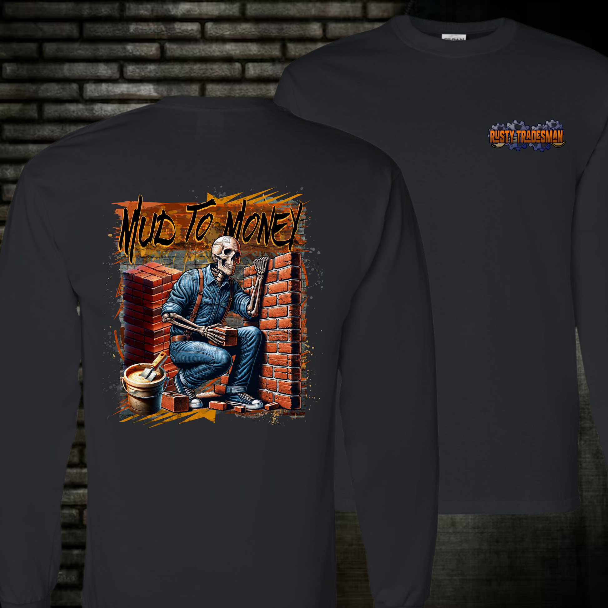 Lay the foundation for bold style with the Rusty Tradesman "Mud to Money" long sleeve shirt! Featuring Rusty the skeleton as a hardworking brick mason, this design showcases Rusty holding bricks against a rugged, gritty backdrop. Celebrating the craftsmanship and grind of masonry, the detailed artwork reflects the journey of turning mud into money with skill and determination. Perfect for bricklayers, tradesmen, and anyone who appreciates blue-collar grit, this t-shirt is as tough and dependable as the profession it honors.