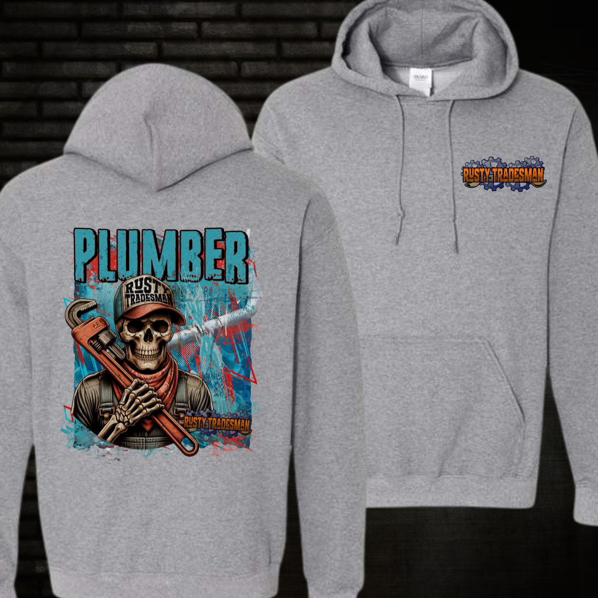 Get ready to turn heads with the Rusty Tradesman "Plumber" Apparel! Featuring Rusty the skeleton holding a trusty pipe wrench, this bold design celebrates the hardworking plumbers who keep the world running smoothly. With gritty textures, a water-themed backdrop, and vibrant colors, this design is perfect for tradesmen, plumbing professionals, and fans of unique workwear fashion. Crafted for durability, it’s ideal for both job sites and casual wear.