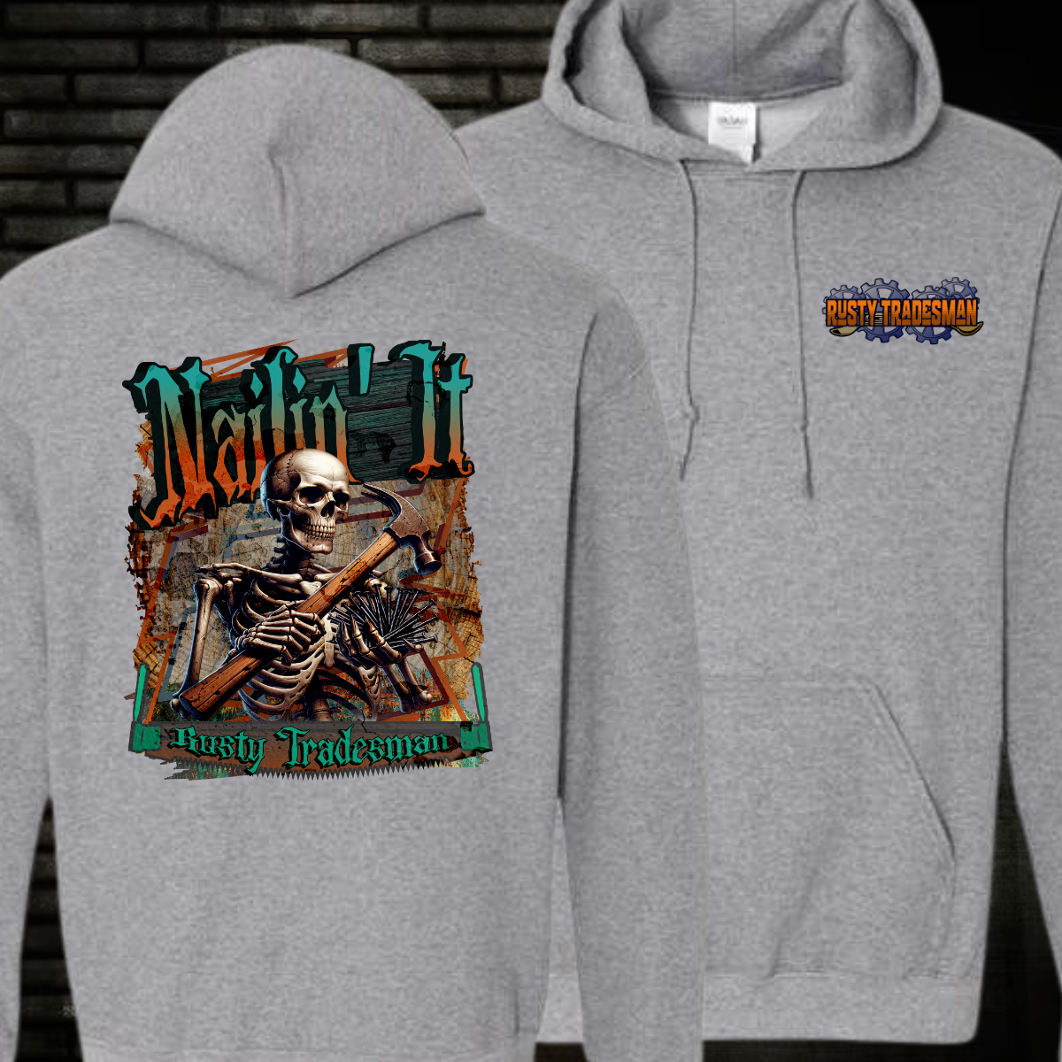 Make a bold statement with the Rusty the Tradesman T-shirt! This edgy design features a striking skeletal tradesman surrounded by a collection of rugged tools, symbolizing strength, resilience, and the raw grit of the hardworking tradesperson.