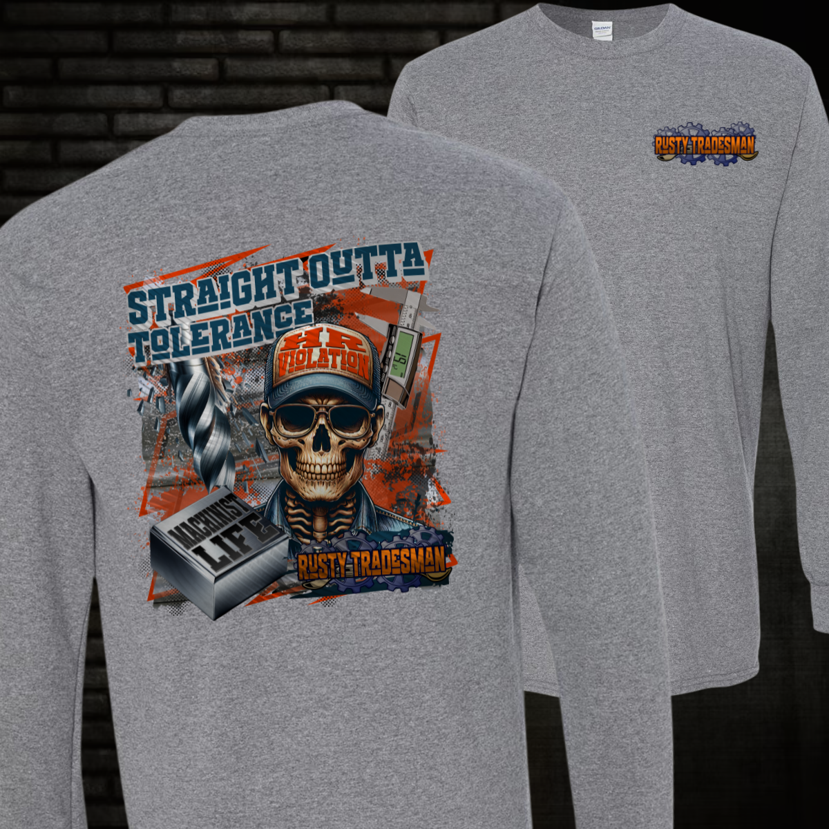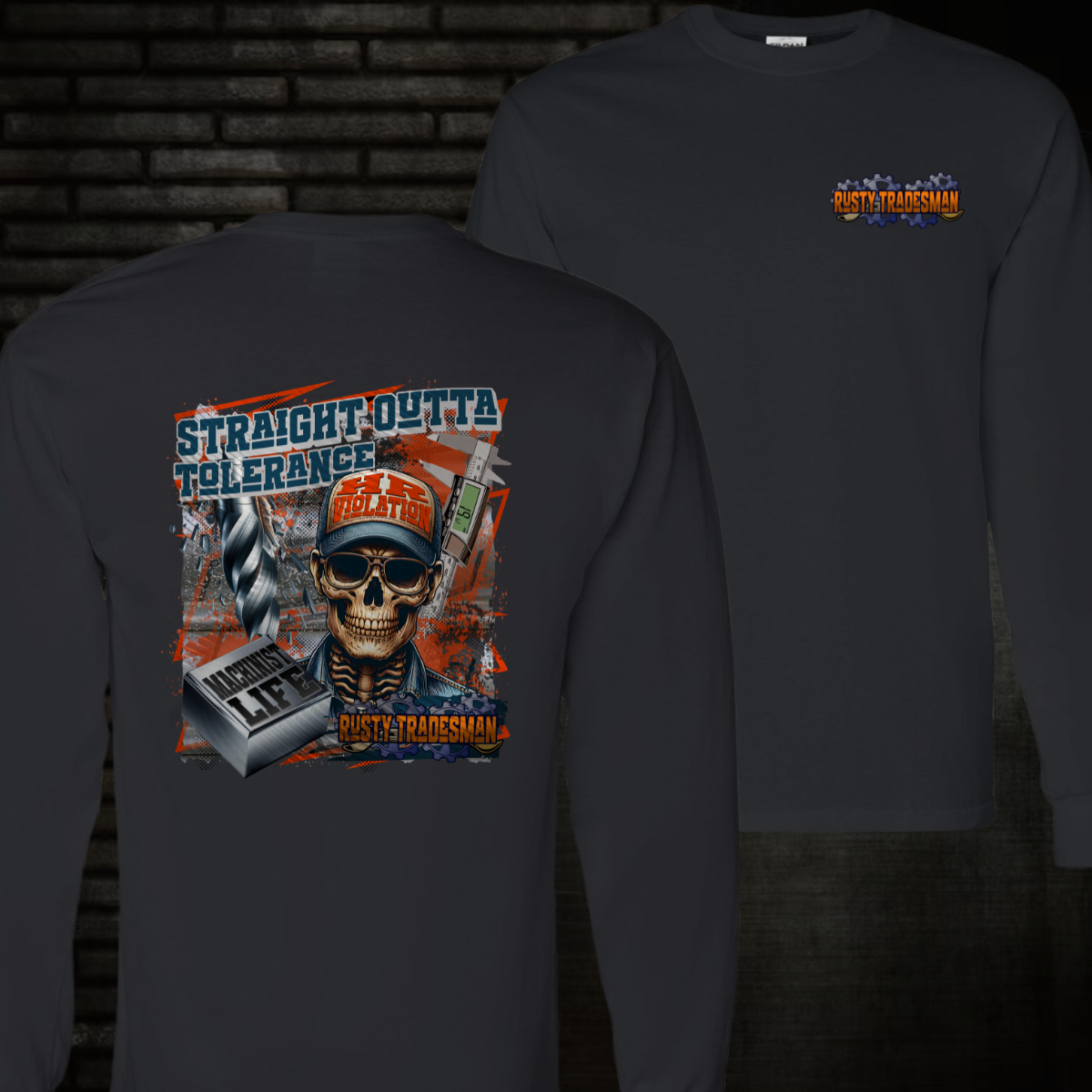 Level up your machinist pride with the Rusty Tradesman "Straight Outta Tolerance" Long Sleeve Shirt! This bold design features Rusty the skeleton, paired with iconic machining elements alongside the humorous "Straight Outta Tolerance" slogan. Made from premium fabric, this apparel delivers maximum comfort and style, whether you're in the shop or out and about. Perfect for machinists, metalworkers, or anyone who appreciates the craftsmanship of the trade.