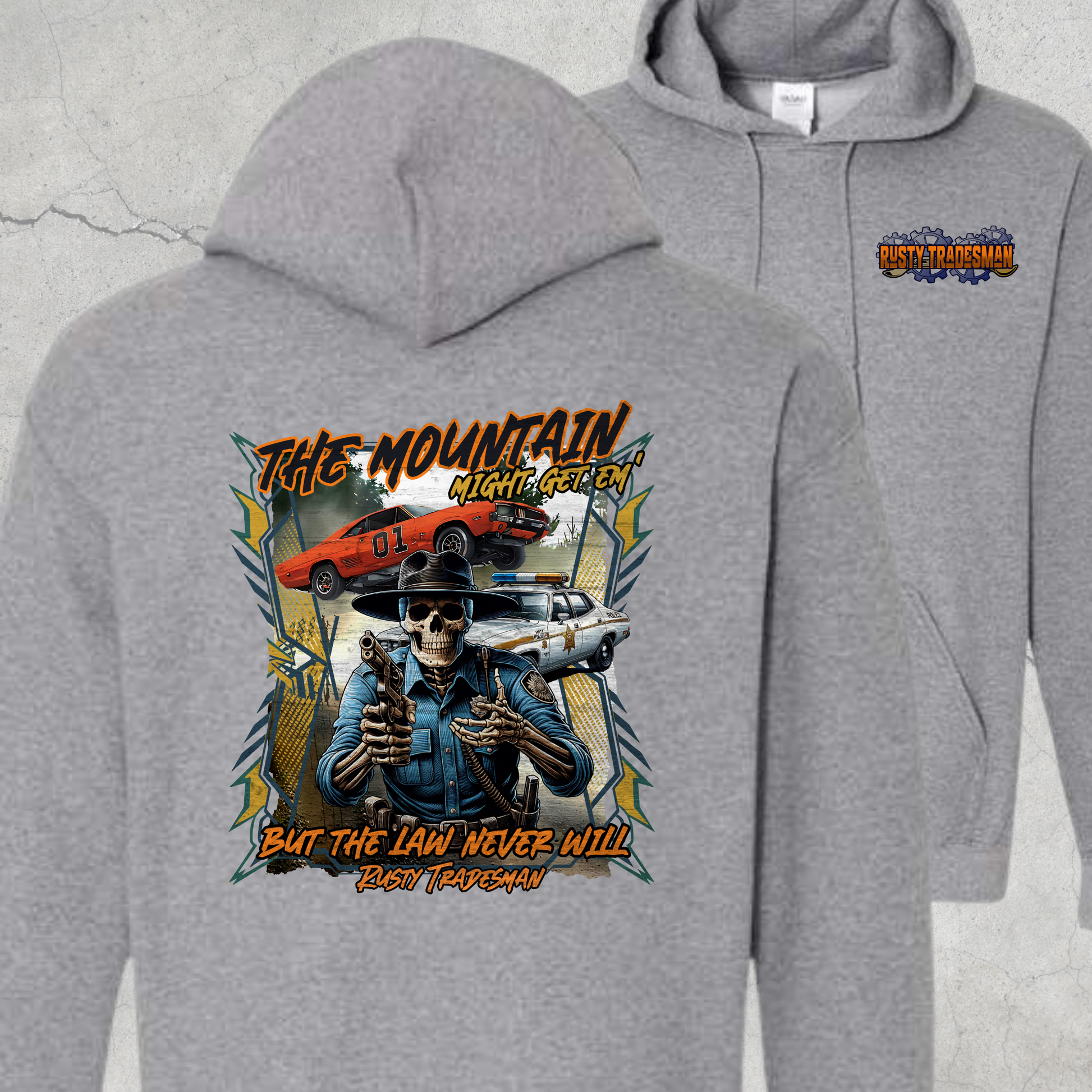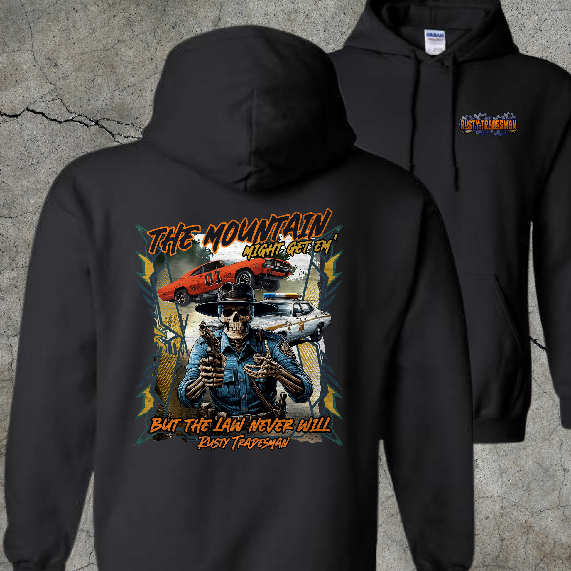 They can outrun the law, but they can't outrun the legend. Introducing “The Mountain Might Get 'Em, But the Law Never Will” – a bold and gritty design from Rusty Tradesman, where raw Americana meets outlaw spirit. This eye-catching artwork features Rusty in full lawman mode—skeleton sheriff, revolver drawn, commanding justice with a cold stare and steady aim. Behind him, the iconic muscle car with the “01” tears through the backroads, dodging a classic patrol cruiser in hot pursuit.