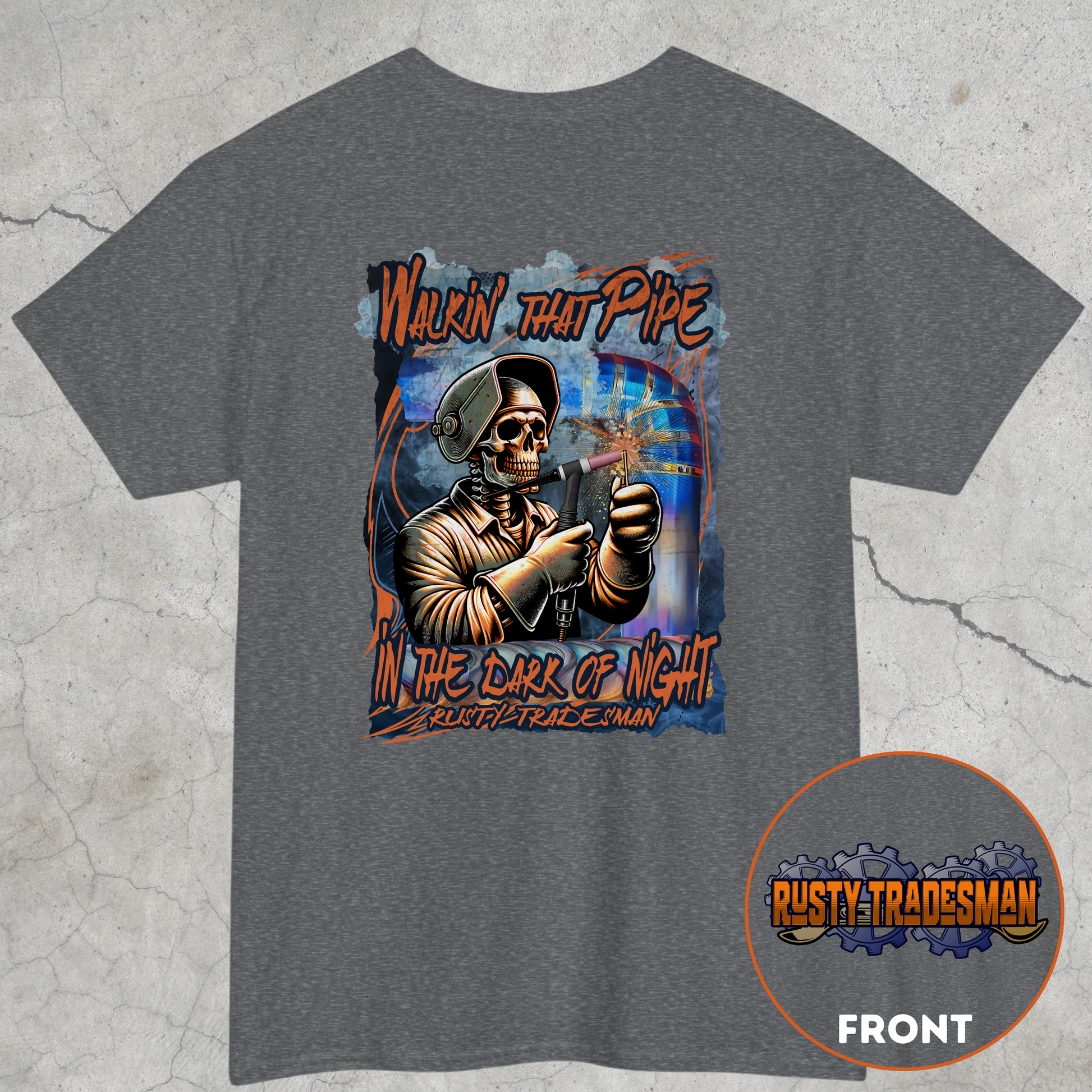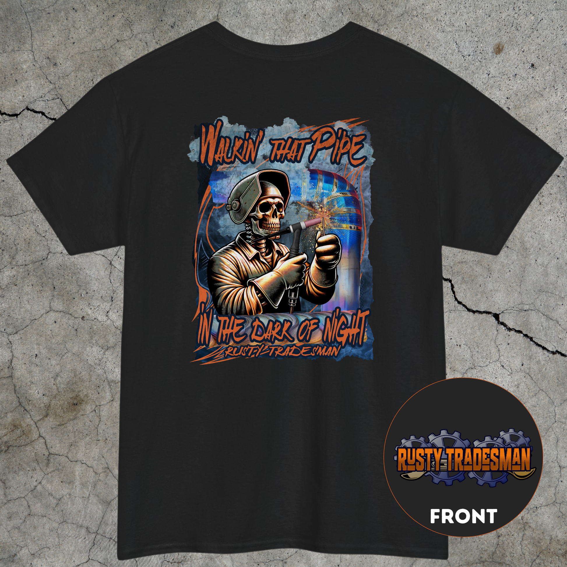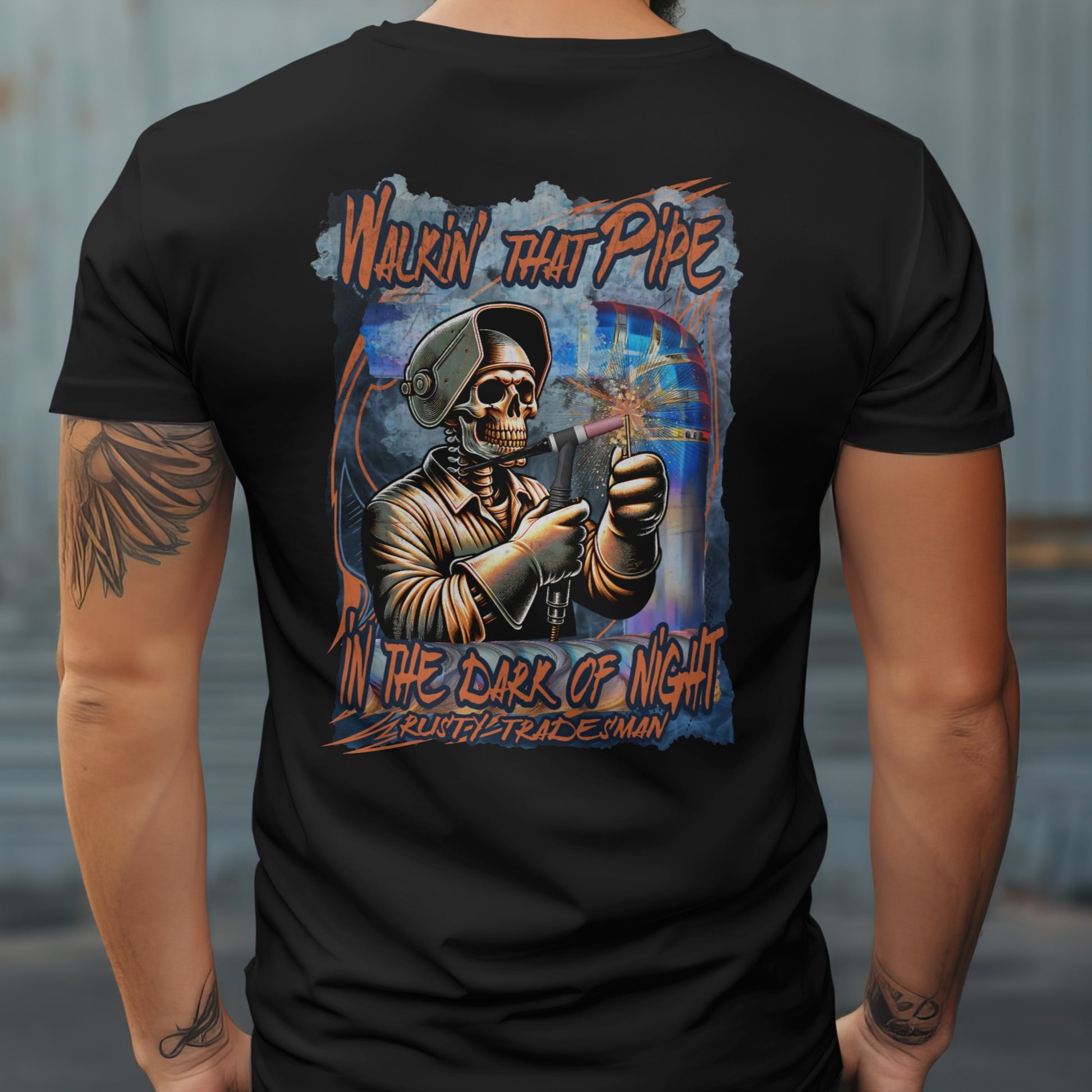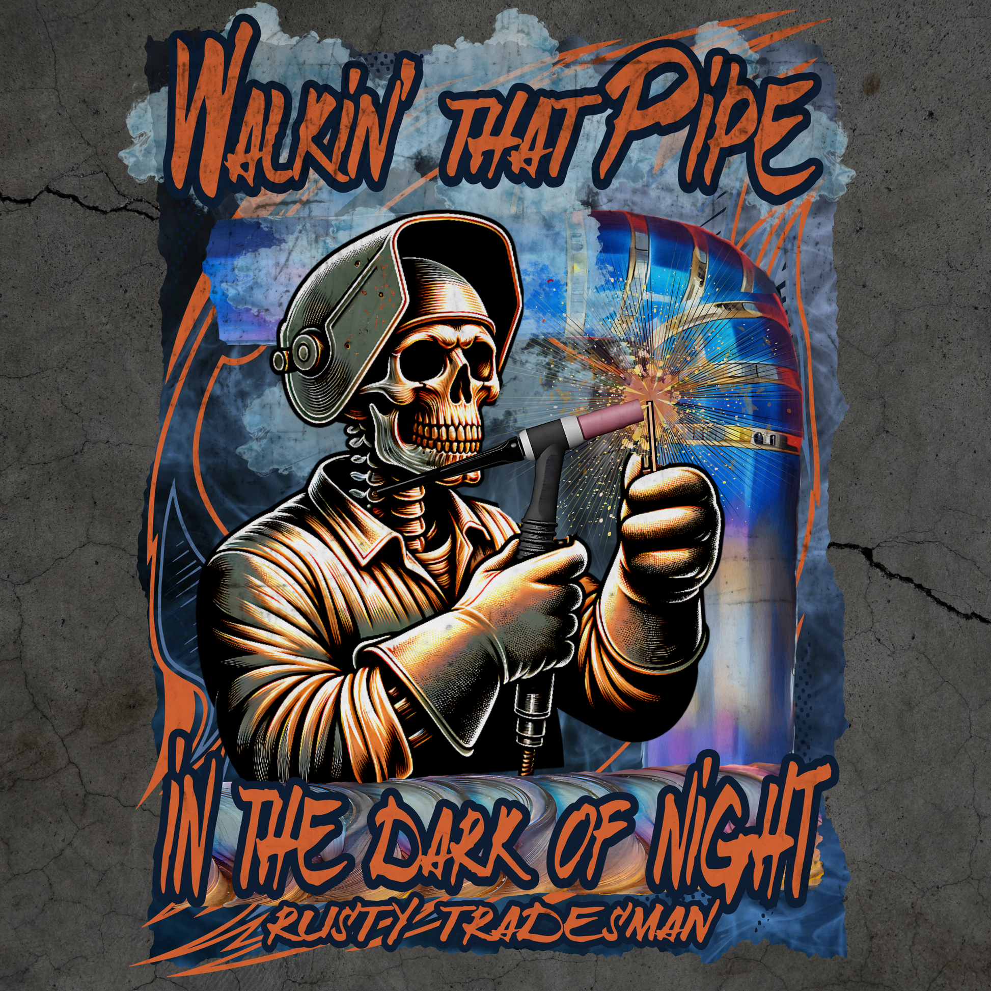When the world sleeps, the real ones are still grindin’. The “Walkin’ That Pipe in the Dark of Night” design from Rusty Tradesman pays tribute to late-night shifts and the silent grind of blue-collar warriors. Featuring Rusty—the skeletal welder in full gear—locked in on a glowing weld seam, this design delivers raw blue-collar energy with every thread. For the night-shift kings and welding beasts, this one's for you.